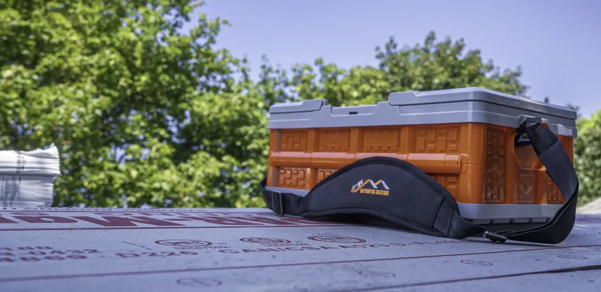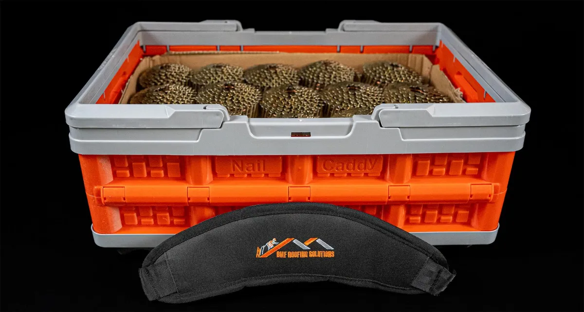 Lift the Nail Caddy with either the strap or handles to your roofing installation area